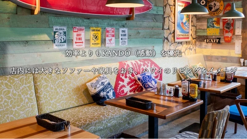 そのポイントは、「圧倒的なハワイ空間」「選ぶのに迷ってしまうほどワクワクする商品」「すべてのお客様を笑顔にする接客」の3つです。これらを軸に店舗の外装や内装からメニュー、家具に至るまで、徹底的に「体験」を重視した選択をしているのが印象的です。