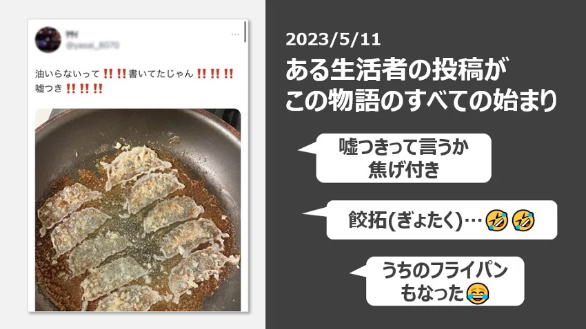 焼け焦げた餃子の皮がフライパンにこびりついた写真とともに投稿されたこの投稿は、X上で話題になり、同様の現象が起きた人の共感の声や、アドバイスなどが寄せられる事態になります。