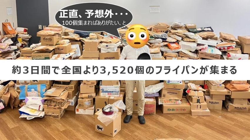 その結果、冒頭に書いたように、なんと約3日間で全国より1000個以上のフライパンが集まり、最終的には3520個も集まることになります。
