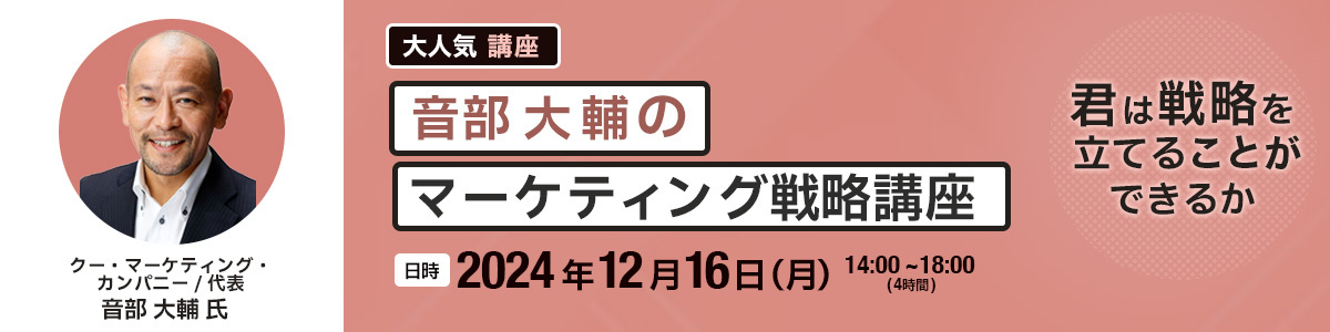 P&Gのマーケティング・ディレクターを経て、ユニリーバ、日産自動車、資生堂など数々の企業でマーケティング組織改革を実行してきたクー・マーケティング・カンパニーの音部大輔氏による1日限定(4時間)の集中講座「音部大輔のマーケティング戦略講座」が、今年も12月16日に開講する。