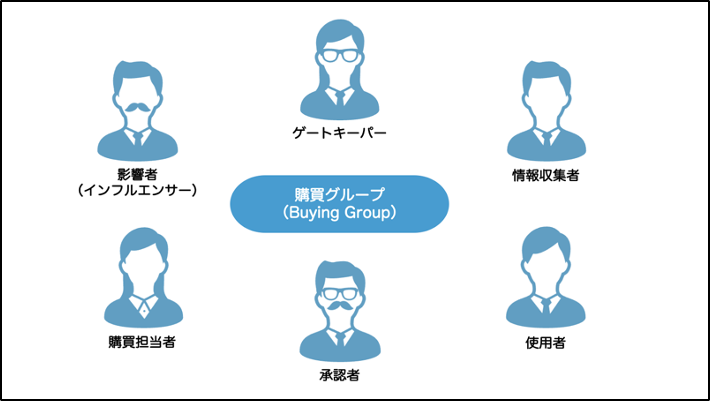 BtoBにおける購買意思決定が、単独の担当者によって行われることは稀である。実際には、情報収集者、使用者、影響者(インフルエンサー)、意思決定者、承認者、購買担当者、そして情報流入を管理するゲートキーパーといった複数の役割を持つ人物で構成される「購買グループ(Buying Group)」によって進められる。