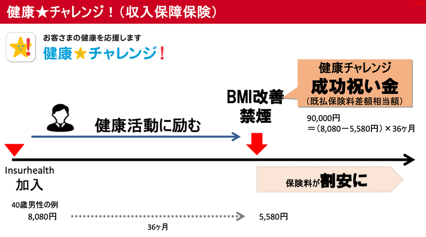 西川:「健康☆チャレンジ!」は、30~40代の働き盛りの方をイメージし展開したサービスです。働き盛りですから、万一の際に向けて高額の保障に加入することが必要となります。加入後、たとえばBMIの改善や禁煙などの健康行動に取り組んでいただき、このチャレンジに成功したらお祝い金をお支払いし、かつそれ以降の月々の掛け金が割安になるという制度です。保険の中に、健康状態が改善されると受け取ることのできるインセンティブが入っているのが「健康☆チャレンジ!」制度です。