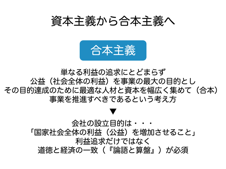 私自身が考えるこれからの日本のあるべき姿は、「資本主義から合本主義」です。「合本主義」とは、日本の実業家で「日本資本主義の父」と呼ばれる渋沢栄一が唱えた独自の経営哲学のことです。これは、単なる利益の追求にとどまらず、公益(社会全体の利益)を事業の最大の目的とし、その目的達成のために最適な人材と資本を幅広く集めて(合本)、事業を推進すべきであるという考え方を意味します。まさに渋沢栄一の「論語(公益)と算盤(私益)」ですね。