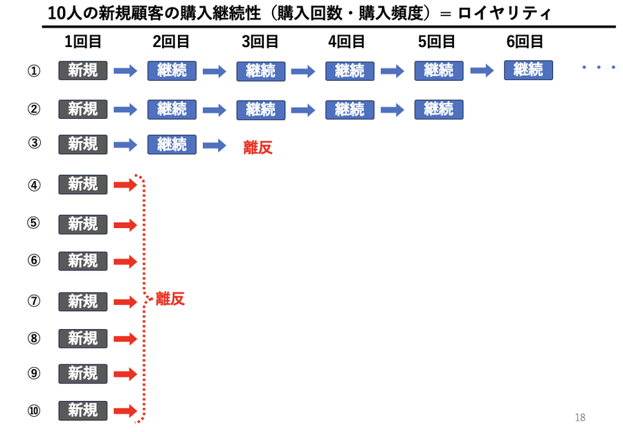 一般的に、どの会社でも新規獲得にかける費用は高く、新規獲得とリピート維持にかける費用の比率は5:1、場合によっては20:1や40:1にまで開くケースもあります。すなわち、新規顧客の獲得は往々にして赤字で、2回目以降の購買から初めて利益が生まれる構造になっていることが多いのです。ですから、本来であれば、下図の④から⑩のように、リピートしない顧客には過剰な投資をしないほうがいいのです。