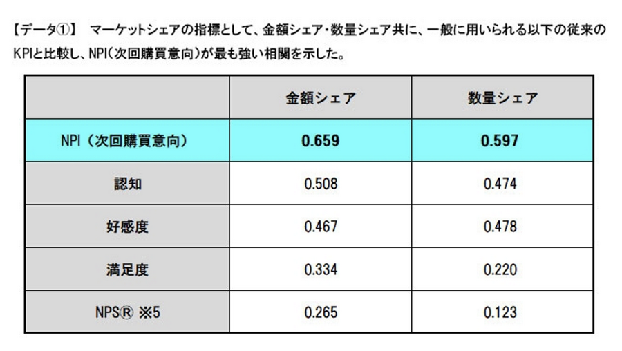 たとえばあるシャンプーブランドで、「次も買いたい」と考える人をNPIがある人、他を選ぶ人をNPIがない人と分類します。このNPIは、将来の売上や数量のシェアの変化と高い相関関係があることが分かっています。