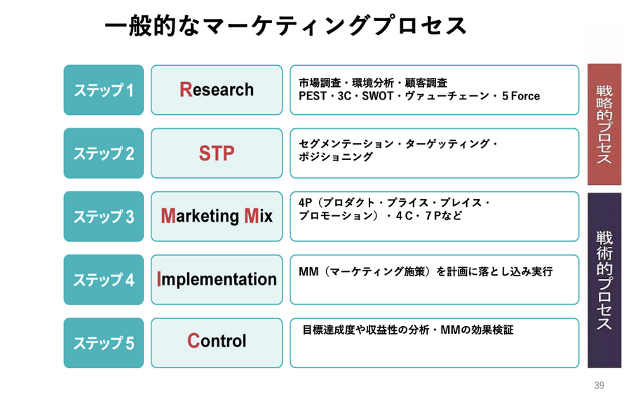西口:多くの企業では、①リサーチ → ②STP(セグメンテーション・ターゲティング・ポジショニング) → ③マーケティングミックス → ④計画と実行 → ⑤管理、という一連のプロセスを回していると思います。