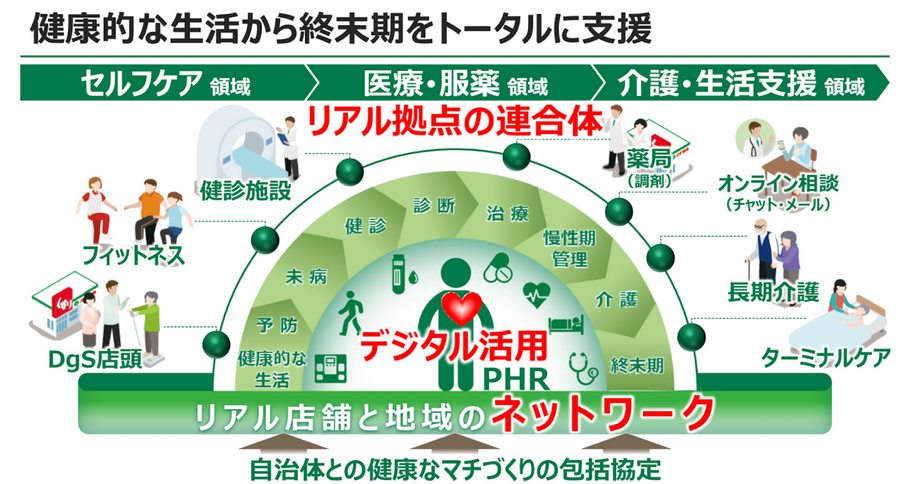 従来、調剤併設型ドラッグストアをロードサイドや都心部の駅前に展開してきましたが、2024年に阪神調剤グループが傘下に入ったことで店舗数は一気に拡大し、現在は全国2200店超を展開しています。ただ、ご存じのように建設費の高騰や小売全体の出店競争があり、「面」の取り合いでは勝てないと認識しています。そこで考えるのは、皆さんと同様と思いますが、人が生まれてから亡くなるまでに必要なモノやサービスを「垂直」に揃えることです。