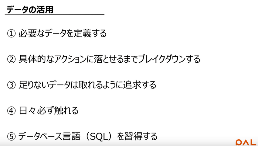 データはアクションによって変化します。毎日データを見ることで解像度が上がり、次のアクションにつながるポイントを的確に捉えられるようになります。そのためポイントと思われるKPIの数字や事例は毎日、メールで社員に共有しています。また、当社は店舗出身の社員が多く在籍しているので、外部企業の協力を得て全員がSQL(データベース言語)を習得し、データを抽出・分析できるように指導しています。こういったことをしないと、本当のデータドリブンな文化や組織は醸成されないと思って取り組んでいます。