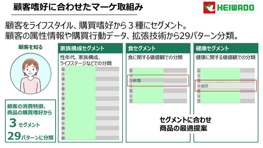 顧客ごとのIDに、社内のPOS、外部の決済データ、アプリを通して得られるオンライン、オフラインのデジタル行動データなどさまざまな消費購買行動データを紐づけ、データサイエンスによる解析とAIによる自動化によって、顧客一人ひとりのライフスタイルを把握できるようになりました。これに沿って商品・サービスをどのように提案していくかがOne to Oneマーケティングの要となります。さらに、当社では顧客に対して直接アンケートをお願いし、食品系商品の購買データをかけあわせ、3セグメント、29パターンに顧客の購買嗜好を分類し、家族構成や食の価値観、健康課題などによって最適な商品を提案するようにしています。