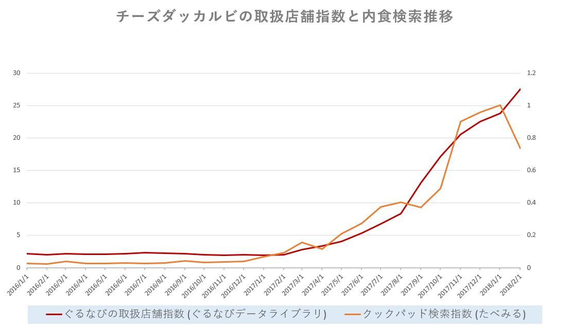 一大ブームとなった「チーズタッカルビ」どこで食べられていることが多いだろうか。まずは内食でのトレンドを示すクックパッド検索指数(1000回あたり検索)と外食でのトレンドを示す、ぐるなびの取扱店舗指数(1000店あたりメニュー掲載)の推移<図>をみつつ、ブームを時系列で追ってみよう。
