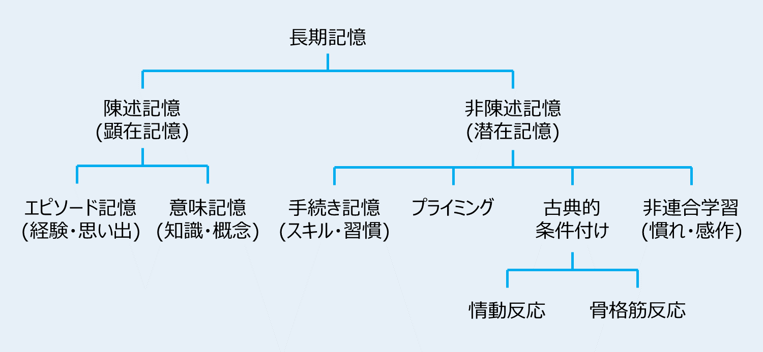 私たち人間の長期記憶には、実はさまざまな種類があります。具体的には、下の図のように、大きく陳述記憶と非陳述記憶に大別され、それぞれに下位区分がなされています。