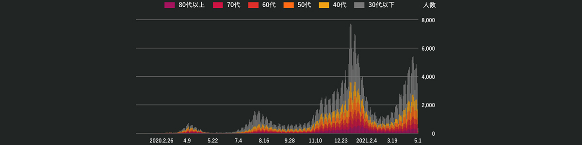 日本における日毎の新規感染者数推移を見てみましょう。第1波が訪れた20年4月、第2波が訪れた20年7月~8月、第3波が訪れた20年11月~21年1月、そして第4波が訪れた21年4月~に目が向きますが、実際に注目すべきは波と波の間です。