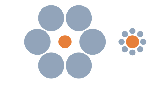当然ながら、色や大きさなどの知覚でも、コンテクストの影響は無視できません。たとえば、超有名なエビングハウス錯視の図を見てみましょう。