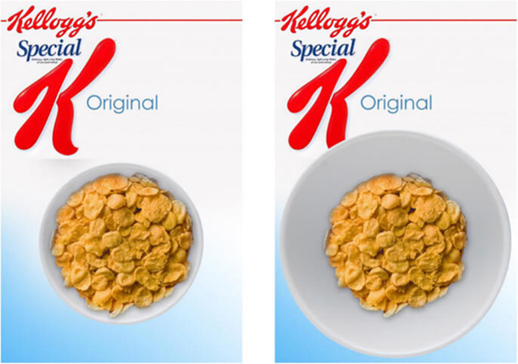 たとえば上の写真は実際にある研究(脚注2・記事末参照)で使われたものです。シリアルの部分の写真はまったく同じですが、実験の結果によると、左のほうが右より27%もカロリーが多いと推測されること、そして、食欲をより強く掻き立てることが報告されています。