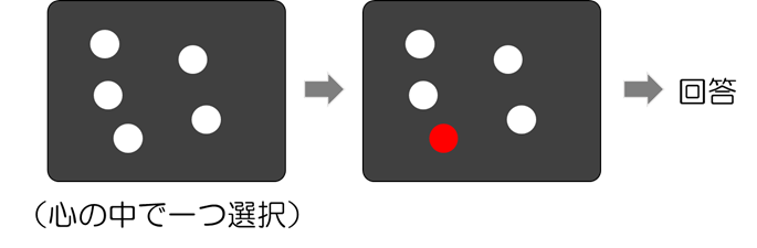 下の図は、短い時間スケールでのポストディクションの実験の一例です(脚注4・記事末参照)。画面上に5つの白い円があらわれて、そのうちの一つが、提示後すぐに赤色に変化します。