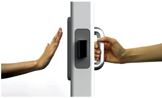 最もよく使われる例の一つが、ドアのハンドルの形状です。押したり、引いたり、ノックしたり、蹴破ったり、潜在的に存在するドアと人との関係性が「アフォーダンス」です。それに対して、下の写真(脚注4)では、ドアノブのところがフラットな板状か握るようになっているかによって、押すのか引くのか直感的に知らせる形状になっています。これが「シグニファイア」です。