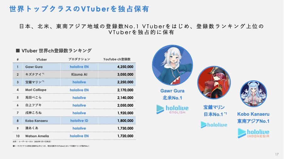 グローバル市場でも活躍するVTuberの可能性についても紹介します。VTuberタレントにおけるYouTubeチャンネル登録者数ランキングで世界1位の「がうる・ぐら(Gawr Gura)」は、2023年の「The Streamy Awards」という米国の配信者を表彰するイベントのVTuber部門で受賞しています。また、ゲーム配信が主流である海外プラットフォームの「Twitch」の中でもVTuberのカテゴリーが創設されたことからも、世界中にVTuber文化が広がりつつあることがわかります。