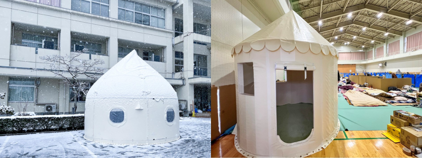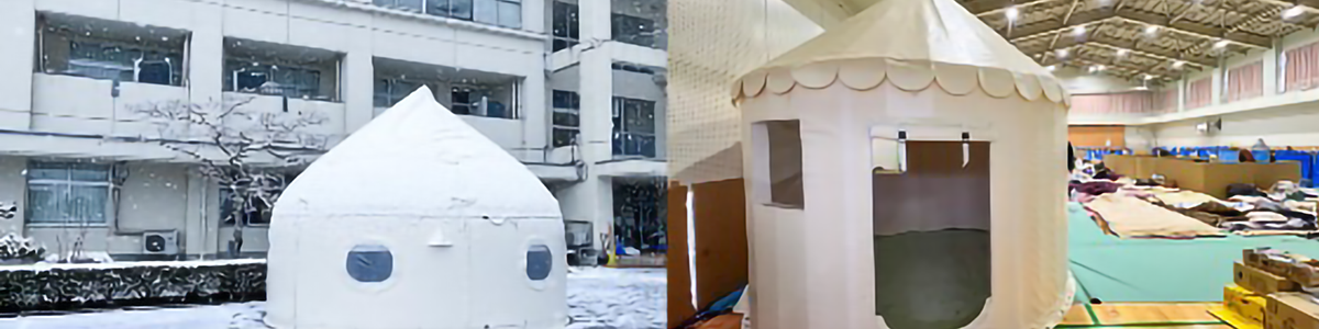 また、避難所に対しては、災害時にも簡単に組み立てられるシェルターとして開発した「インスタントハウス」を提供させていただきました。断熱性や耐久性に優れ、さらに耐震性、耐風性をあわせ持つことから、ワークスペースや宿泊スペースだけでなく医療救護室や休憩所、断熱を要する備蓄倉庫などにも活用できます。校庭、キャンプ場、駐車場など屋外に設置して避難所の拡張機能として利用いただくことが可能で、集団生活が困難な障がい者、乳児、要介護者、ペットなどのケアや、疾病予防にも役立てていただいております。