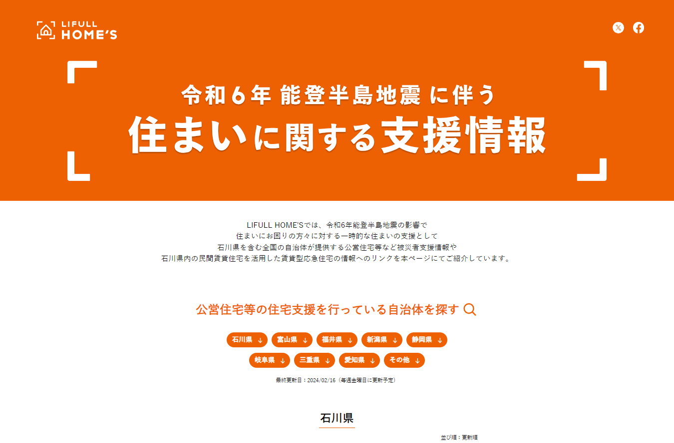 LIFULL HOME’Sでも先日、プロダクトチームが「能登半島地震に伴う住まいに関する支援情報のサイト」を立ち上げました。一時的な住まいをお探しの方のために、近隣各県など全国の自治体が提供する公営住宅などの被災者支援情報や、石川県内の民間賃貸住宅を活用した賃貸型応急住宅の情報へのリンクをご紹介しています。