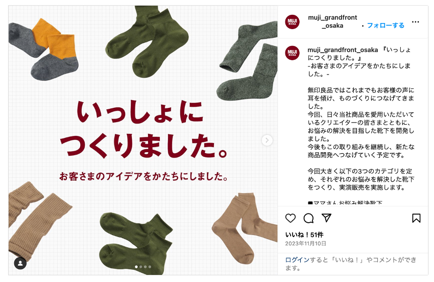 無印良品がアンバサダーさんとの取り組みで商品開発をしたとき、「無印良品 グランフロント大阪」がInstagramに取り組みを紹介した投稿