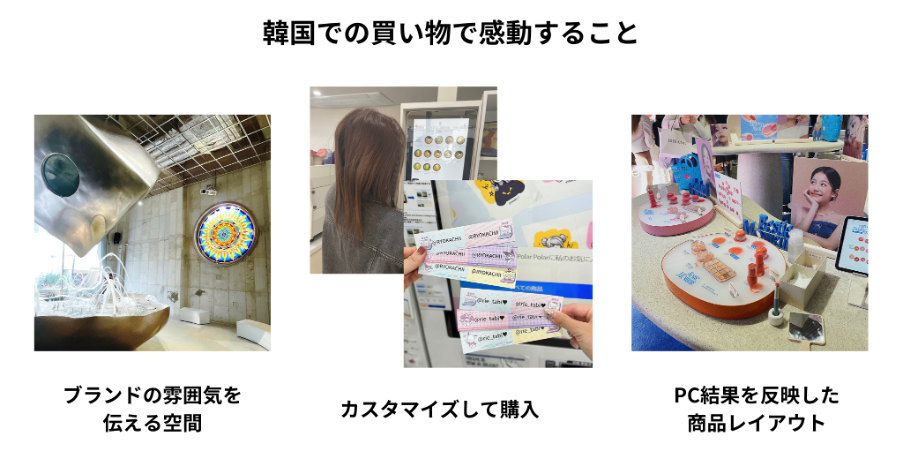 そして、アパレル店でよく見かけたのが、最近人気の韓国プリクラだ。しかも各ブランドオリジナルのデザインが縁にほどこされていて、各所違うデザインで撮影できる。こちらも明洞の「WiggleWiggle」というお店で体験したのだが、写真を取り出してみるとばっちりブランド名が書かれている。買い物している以外のアクティビティも楽しくて思い出に残る体験だった。カラフルで楽しいブランドの雰囲気をまさに “体験化” しているようにも感じた。