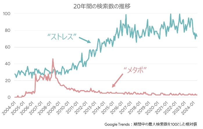 ためしにGoogleトレンドで「ストレス」という用語の検索数の推移をみてみると、上の図の水色の通り、過去20年間では2010年代の前半に伸びた後、そのまま高止まりしています。比較のために、同じ健康関連の「メタボ」(メタボリックを含む)をみると、2000年代後半に一時的にストレスを超えるほどの数字を付けた後、すっかり鎮静化しています。ストレスの検索数の推移は、グーグルの仕様や利用数などの要因よりも、関心の高止まりを反映しているのでしょう。