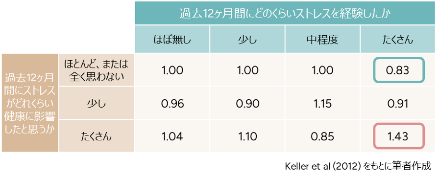 有意にリスクが高かったのは、ピンクの四角で囲ったところのみです。ストレスの多寡だけが影響するような単純なものではなく、ストレスを多く受けた人のなかでも「ストレスは健康に悪影響すると思っている」人のみが、他より早い死亡につながるようです。思い込みによって、実に43%ものリスク増加です。