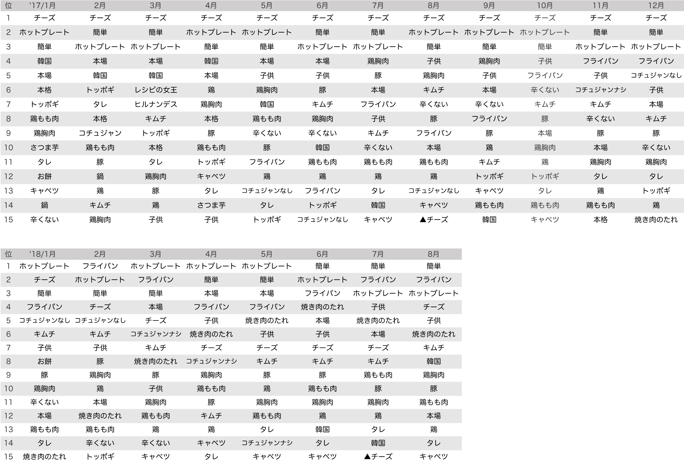 レシピ検索の場合は、1キーワードでの検索だけではなく、複数キーワードを組み合わせて検索される場合も多い。タッカルビとの組み合わせ検索の状況を確認してみたところ、2017年は、チーズとの組み合わせが継続して1位となっていることがわかる(図1)