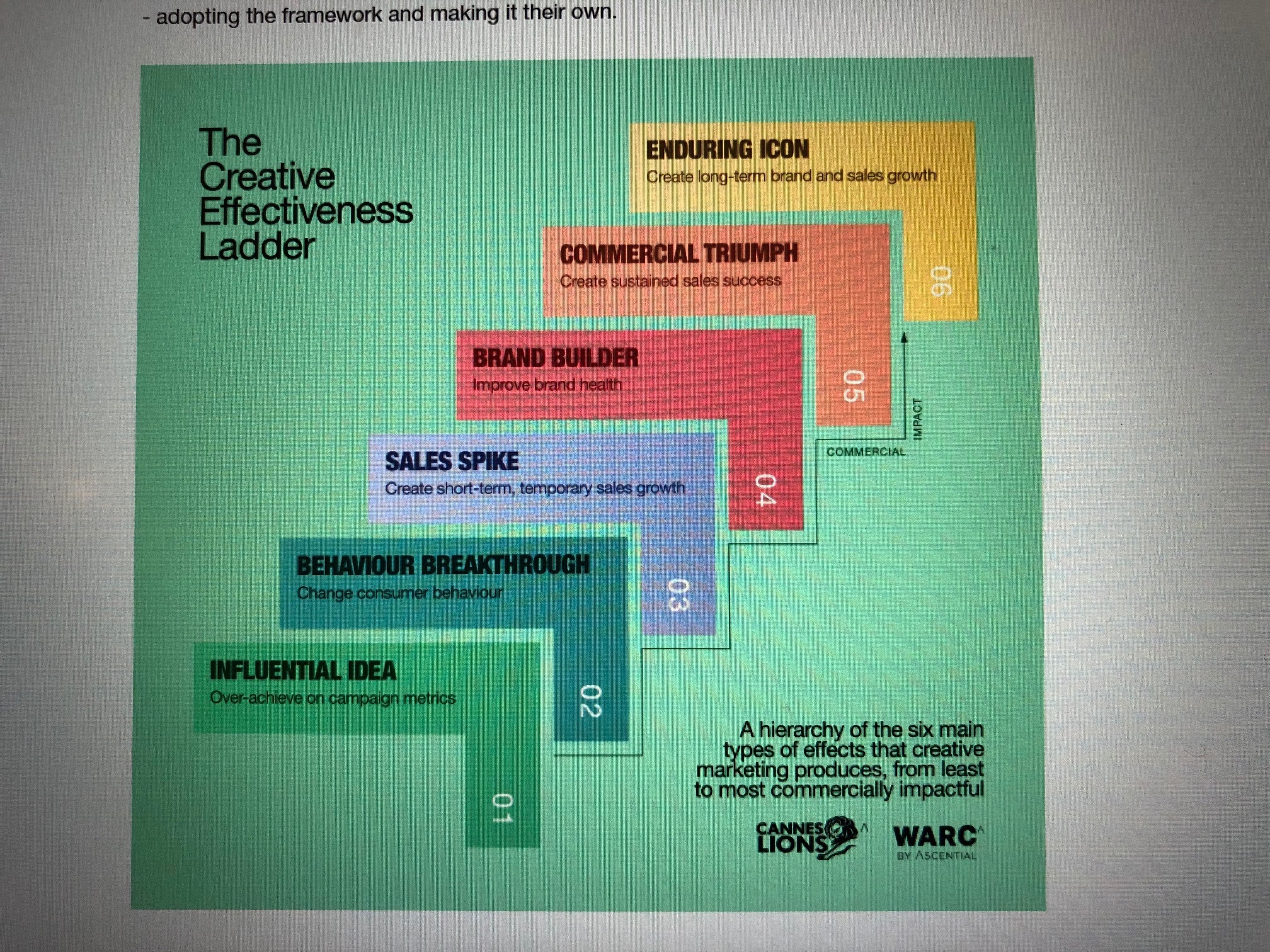 論点は3つです。第1に受賞するようなクリエイティビティの高い広告こそ効果があるということ。第2に自分たちで設定した「クリエイティブ・エフェクティブネス・ラダー(クリエイティブ効果の段階)」を発表し、効果には6つの段階(ラダー)があると主張。第3に同じく自分たちの用語である「クリエイティブ・コミットメント」を紹介しました。
