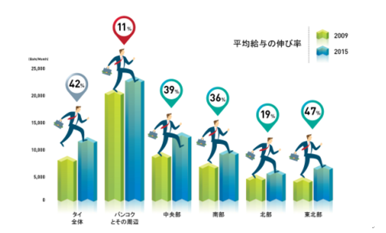 下記グラフはタイ地方別の平均給与の伸び率を比較したものです。