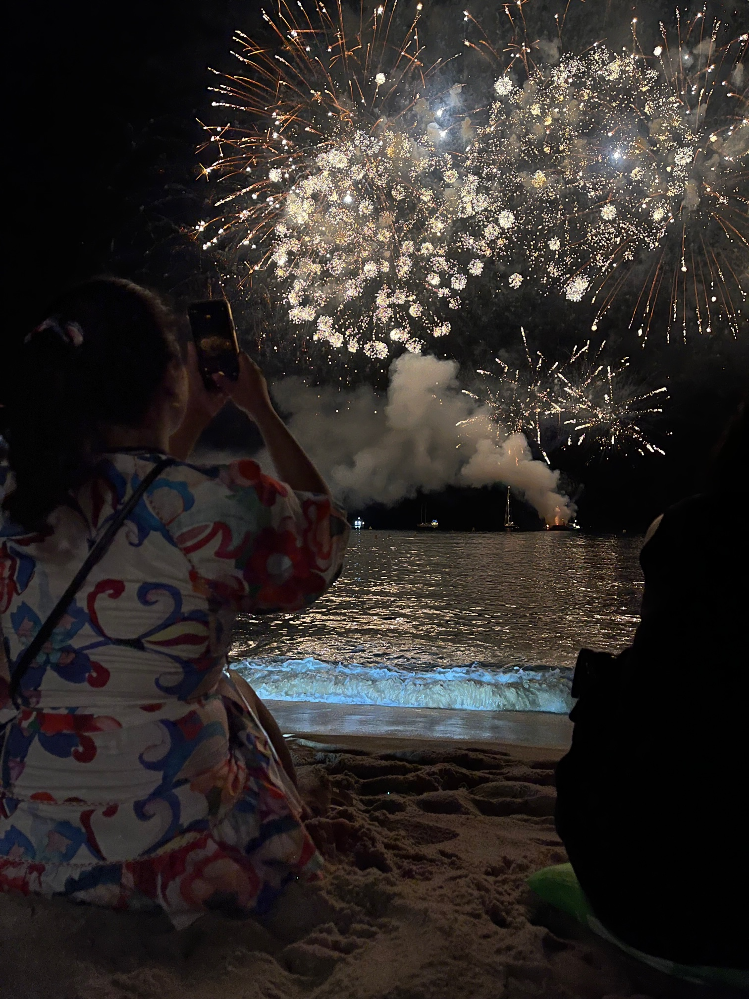 クロージング・パーティでは花火も。浜辺に腰かけて見ることが出来る。