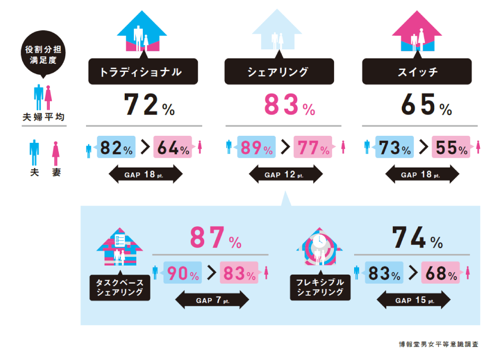 私たちも調査を行うまでは、フレキシブルに役割分担する夫婦は、満足度が高いのではないか、という仮説を持っていたのですが、見事に外れる結果となりました。