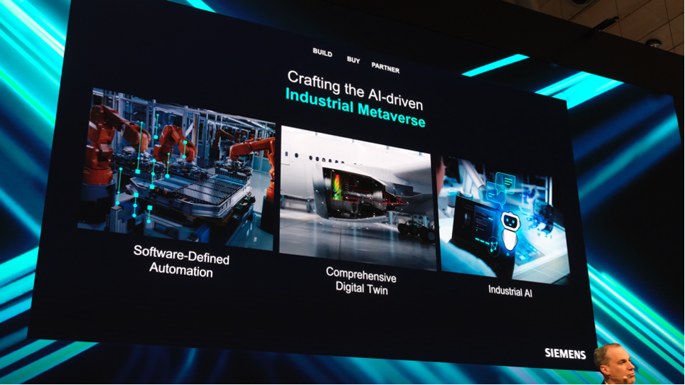 さて、具体的にどのような発信をしていたのか解説しよう。SIEMENSは、「インダストリーメタバース」を軸とした取り組みを披露した。注目は、AIやデジタルツイン(現実の世界から収集したデータを基に、まるで双子であるかのように、仮想空間上に現実世界を再現する技術)、ソフトウェアによるオートメーションの融合による製造現場の再構築である。