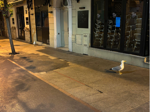 深夜の街並みを歩いていると、海鳥が街のど真ん中を
