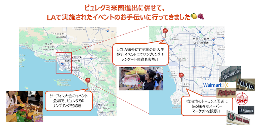 出張の主目的は、「ピュレグミ」の米国進出に合わせてロサンゼルスで実施したイベントのお手伝い。サーフィン大会「Super Girl Surf Festival」と、UCLA(カリフォルニア大学ロサンゼルス校)周辺で開催されるイベント「Westwood Village Block Party」の会場で、ピュレグミのサンプリングを行ってきました。