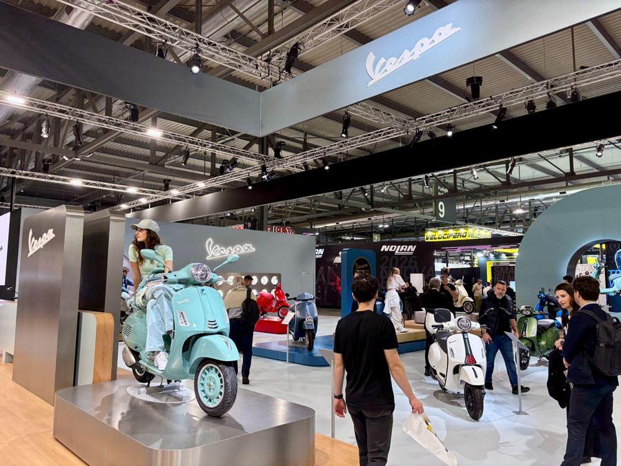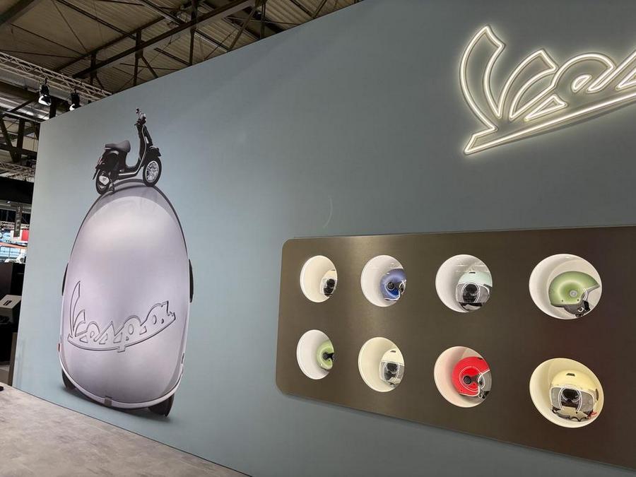 同じくイタリアの Vespa は、ファッション性を前面に押し出した世界観が印象的で、ヘルメットの展示やモデル着用の服装まで含め、トータルでコーディネートされている。ブース内には多彩な色が効果的に配置され、写真映えを意識した設計となっていた。