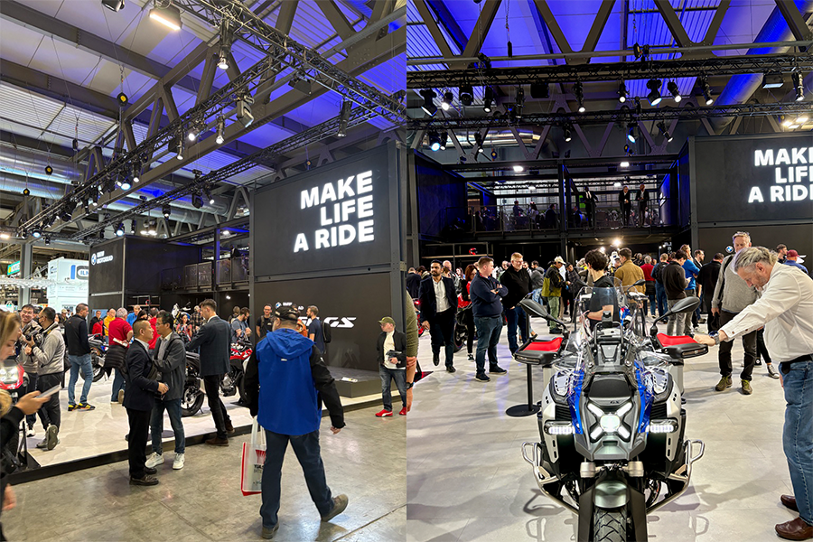 BMW Motorrad は、レース会場のピットを思わせる空間演出が特徴的で、タグラインである MAKE LIFE A RIDE が写真や動画にも収まりやすい位置に配置されている。体験とメッセージが同時に伝わる設計だ。