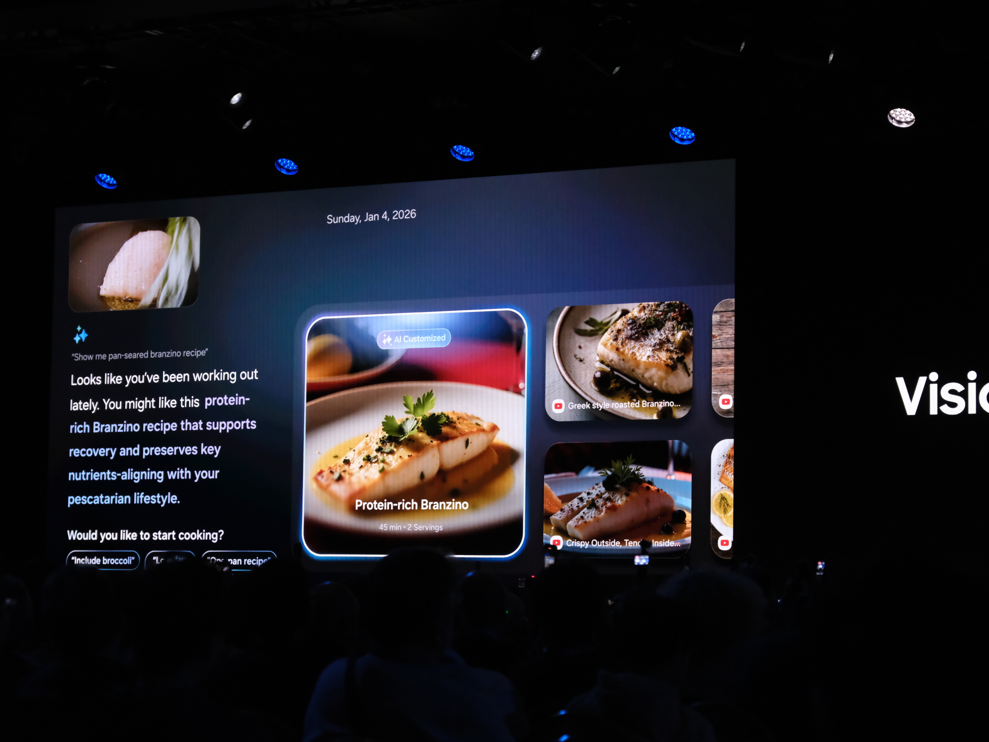 核となるのは、Samsungのスマートホームプラットフォーム基盤であるSmart Thingsを軸としたマルチデバイス連携と、on-device AI(端末内AI)とcloud AI(クラウドAI)の併用による分散型の知能設計であるという。テレビでは「Vision AI Companion」を通じて、AIドリブンな視聴体験を実現。テレビで見た料理のレシピを生成AIが提案して冷蔵庫へ送信できるほか、料理動画がレシピの手順書に変換(生成)される様子が紹介された。