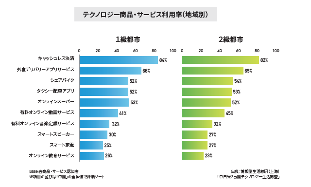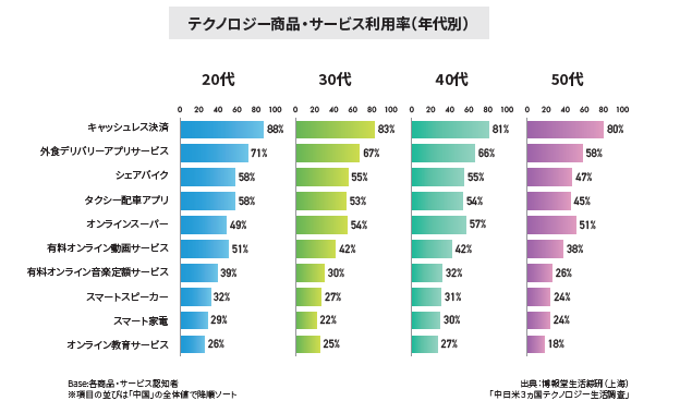 さらに、今回の3カ国定量調査で分かったことは、中国生活者のほとんどがテクノロジー生活をポジティブなイメージ(肯定的な回答の割合:中国97%、アメリカ66%、日本52%)で受け止めているということでした。テクノロジー商品・サービスの利用が日米と比べても進んでおり、かつ都市間の差や年代の差もないほどに、幅広い生活者の中にテクノロジーが浸透していることが明らかになっています。