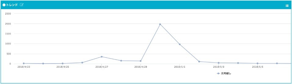 どちらも、ほぼ同じような傾向を示し、極めて似た性質を持ったキーワードだと分かります。「元号越し」は4月27日に少しだけトレンドが上がっていますが、それは次のツイートによるものです。