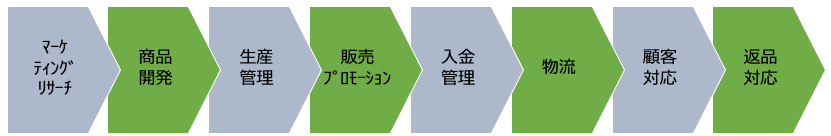 私が所属しているフェリシモはSPA(製造小売)型の通販で、バリューチェーン風に図示すると次のようになります。流通系で商品を仕入れる場合も、BtoCのECであれば、だいたいこのような形になると思います。