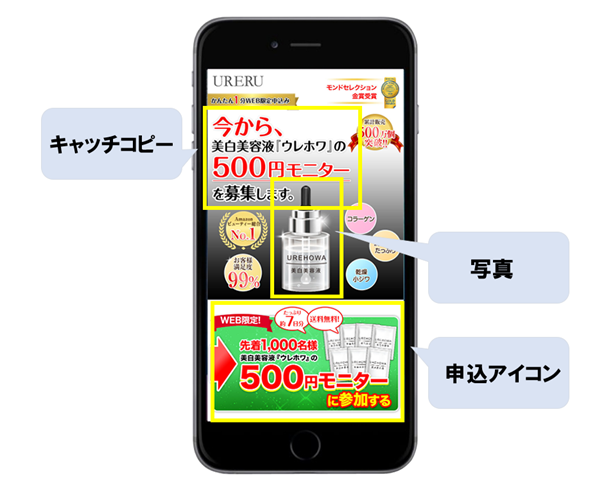 「申込アイコン」では、申し込める商品と、そのお得さを端的に表現することも重要である。売れるネット広告社のクライアントは、ファーストビューの「申込アイコン」に商品写真を載せたり、特典や限定感を訴求したりすることでコンバージョン率を劇的にアップさせている。