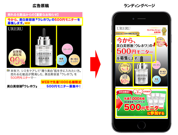 お客さまは広告原稿(ディスプレイ広告)の内容に興味を持ってクリックし、ランディングページに到達している。それなのに、広告原稿(ディスプレイ広告)とランディングページの印象がちぐはぐだったらどうだろうか。「思っていたものと違う」と感じたお客さまは一瞬で立ち去ってしまい、二度と戻ってこないだろう。