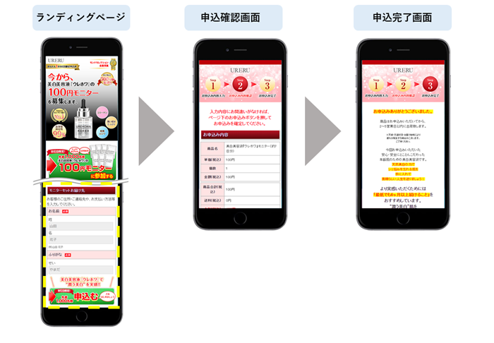 お客さまが申込フォームに個人情報を入力したら、あとは申込確認画面と申込完了画面があるだけというシンプルな構造で、離脱を最小限に抑えることができる。ズバリ、ランディングページを「申込フォーム一体型」にするだけで、コンバージョン率は約1.5倍~2.5倍は上がる!
