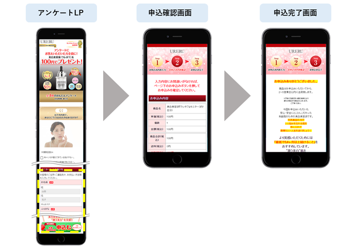 「アンケートランディングページ」という変化球でも、フォーム一体型にしてページ遷移を短くするという大原則は変わらない。そうすることで、「アンケートランディングページ(兼申込フォーム)」があって、お客さまが個人情報を入力した後は、“申込確認画面”と“申込完了画面”があるだけというシンプルなフローになる。