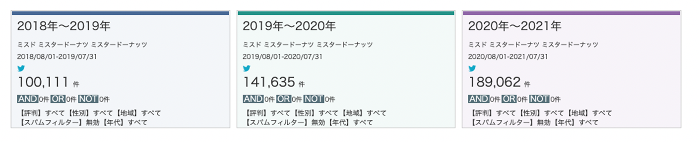 さらに調べてみると、実は2021年第1四半期のダスキンのフードグループ売上高が、前期に比べて30%増であることがわかった。不採算店舗を閉めたミスタードーナツは、コロナ禍にも関わらず徐々に売上高を上げていたのだ。加えて、ソーシャルについてさらに詳しく見ていくと、世の中におけるミスドの立ち位置が、時代の流れによって少しずつ変化していることもわかった。