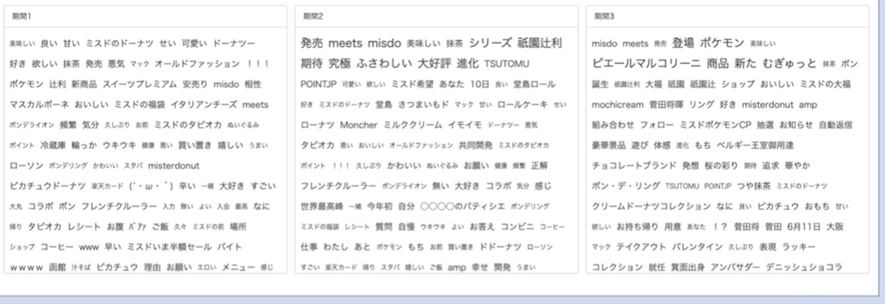 さらに、その内容を深く見ていくと面白い。Tweetの頻出ワードを見てみると、「misdo meets」や「ポケモン」「ピエール・マルコリーニ」についての言及がここ2年間増えているのである。