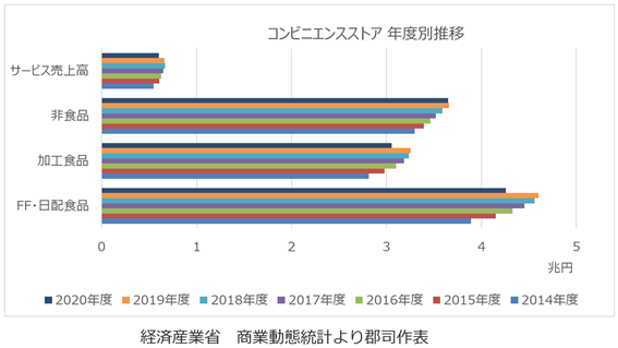 コンビニエンスストアの実績は2019年まで各分野順調な増加を示してきました。ところが、業界として年間1000~数1000店舗出店していた増加数が2017年度から鈍り、2018年度の5万6586店舗をピークに微減を始めています(2020年度末5万6176店舗)。これは2018年度をピークに、客数に比例しやすいサービスの売上が低下し始めたこととも連動します。