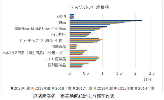 ドラッグストアの実績は全体として右肩上がりですが、部門ごとにまったく違う動向を示しています。