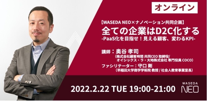 早稲田大学が次世代を創造するリーダーたちの共創の場として社会人向けプログラムを提供している「WASEDA NEO」と、マーケティング領域のカンファレンスを行うナノベーションの共同企画であるオンライン講座「トップマーケターから学ぶマーケティング思考と実践」の第9弾が2月22日に開催される。